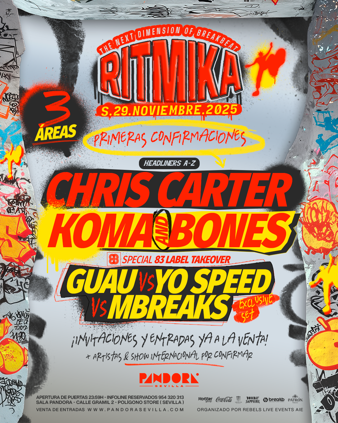 Dos ediciones de Ritmika este año, dos absolutos éxitos. ¿Vamos a por la tercera? El 29 de noviembre traemos quizá, el mejor cartel que haya habido de una fiesta breakbeat en Pandora (y ya es decir). Chris Carter, Koma and Bones, un takeover del 83 label y muchísimas sorpresas más. ¡Y Pandora abierta en su totalidad! ¿Qué más necesitas? Corre a por tu invitación.