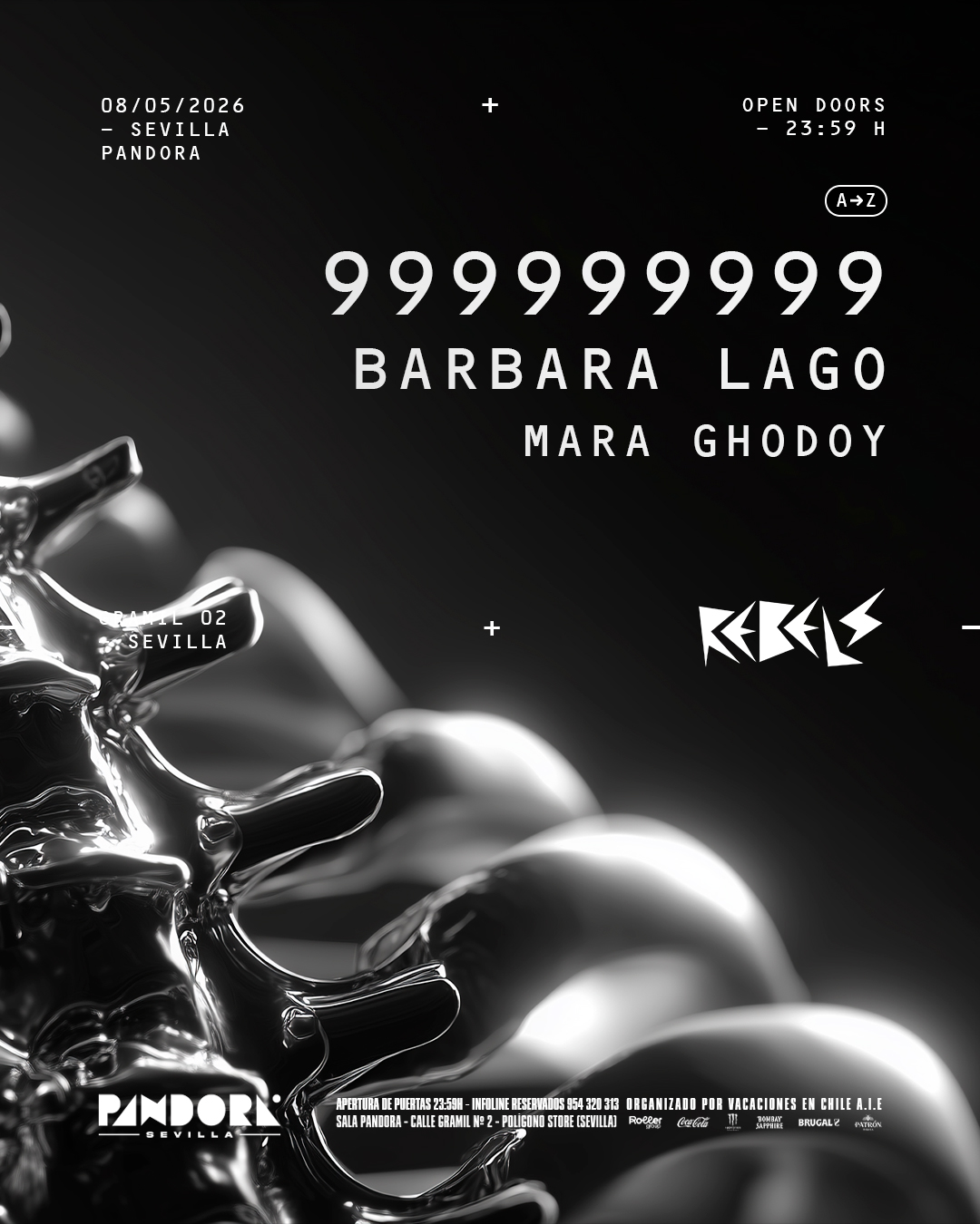 Rebels vuelve a abrazar su faceta más hard con la llegada de uno de los dúos más icónicos de la escena techno contundente. Con un toque ácido, 999999999 llegan por primera vez a Pandora Sevilla para demostrar que solo saben regalar noches de diversión. Y si a ello le sumamos a Bárbara Lago y Mara Ghodoy, esta fiesta solo puede ser un éxito asegurado.